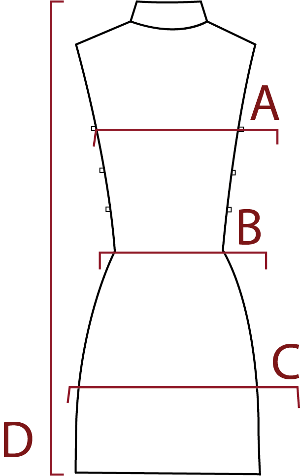 | TALLE | A:BUSTO | B:CINTURA | C:CADERA | D:LARGO |
